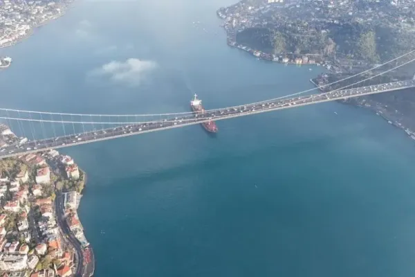 Foto dari udara yang diabadikan menggunakan drone pada 11 Desember 2025 ini menunjukkan pemandangan di kawasan Selat Bosphorus di Istanbul, Turkiye. (Xinhua/Liu Lei)